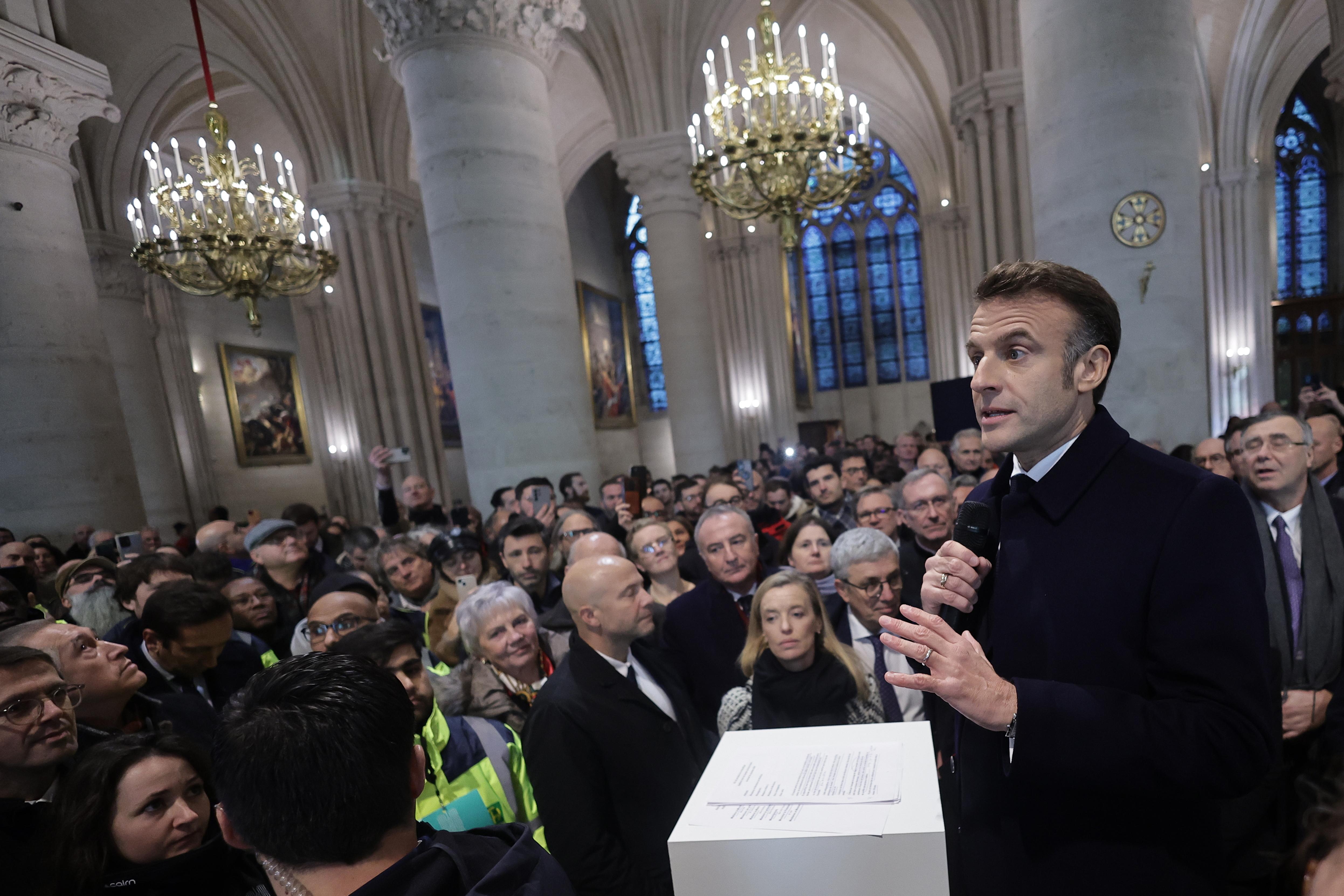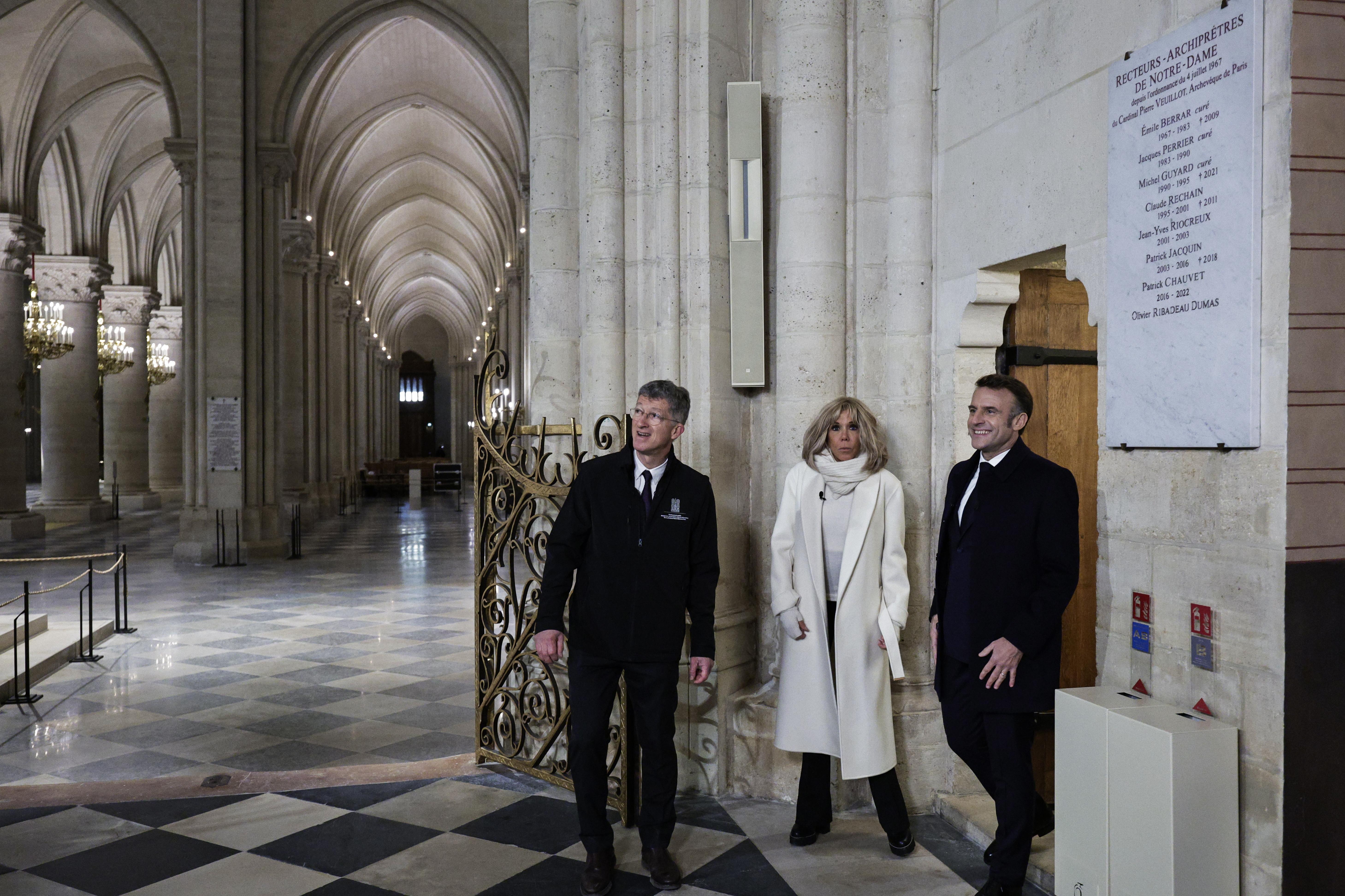 8 дни преди повторното отваряне на катедралата на 7 декември 2024 г. Макрон направи инспекция, излъчена на живо по телевизията, която даде първата официална представа за това как изглежда 850-годишната сграда отвътре.