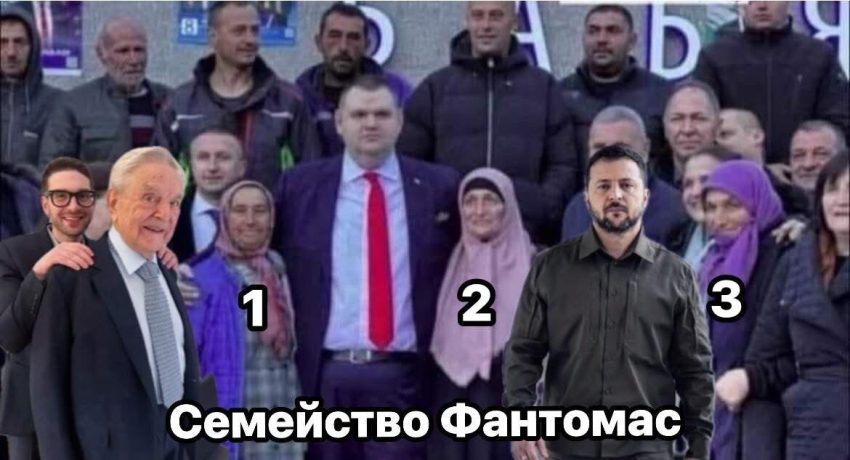 От ляво на надясно: Алекс Сорос, Джордже Сорос, Ревански, Фантом 1, Пеевски, Фантом 2, Зеленски, Фантом 3 … (на снимката)