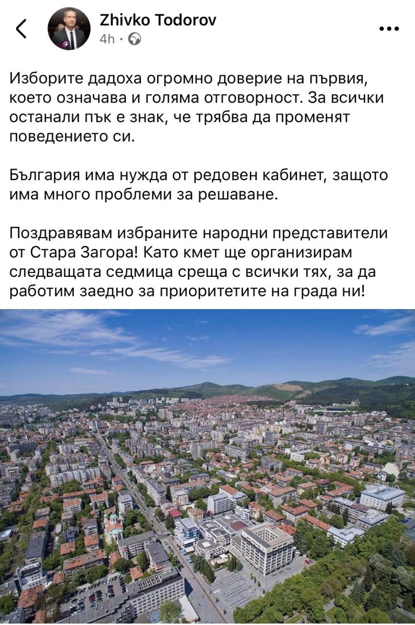 Кметът на Стара Загора Живко Тодоров, който е едно от най-емблематичните лица на ГЕРБ и от най-харесваните кметове в България, подкрепи Румен Радев и индиректно разкритикува ГЕРБ и ДПС, които претърпяха истински изборен крах и се занулиха. Тодоров бе от първите домакини на Румен Радев, малко след като той напусна поста на държавен глава и влезе в политиката на 3 март тази година. Ето какво пожела Живко Тодоров във фейсбук: