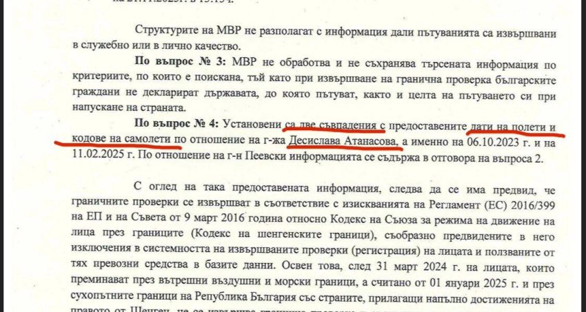 Допълнително МВР ни дава и две дати на излизане на Десислава Атанасова от България в посока Турция, които съвпадат с полетите на Фалконите на Пеевски и на самия Пеевски.